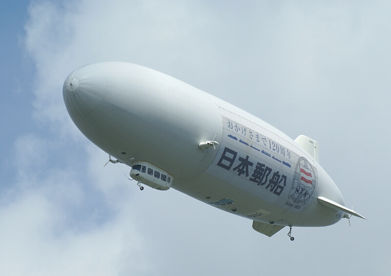 「日本郵船」と書いてある(よ~く見ると文字を書いたシートをひもで船体にしばりつけてある)のは現在の広告主で、今年の6月までは「BMW」の広告を貼り付けた“BMW号”として日本全国の空を飛んで‥‥‥いや、浮遊していたらしいので、どこかで見かけた方もいるはずだ。