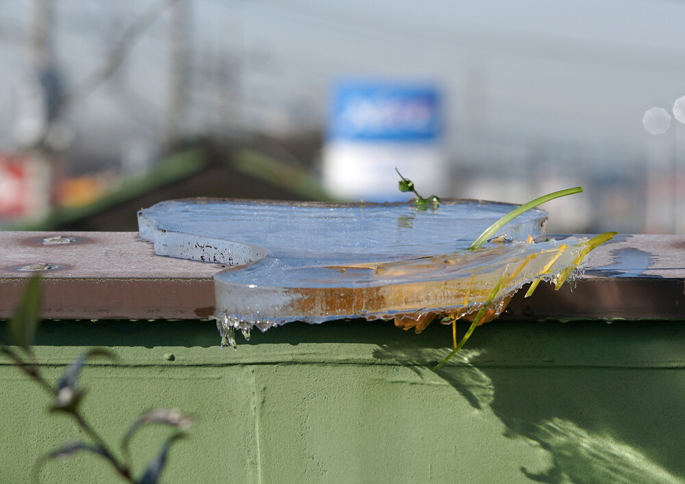 昨夜から今朝にかけては今冬で一番寒かった感じで、TWK屋上の池(ってほどのものじゃないけど^_^;)にはこ~んなに厚い氷が張ってました↓