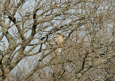 1月18日に初めて立ち寄った時、人っ気がまったくなくカワセミをたっぷり見ることができた水路で今回は工事が行なわれていて、しばらく観察していたがカワセミが来る気配はなかったので、前回行ってなかった方へ歩きはじめると、遠くの木に猛禽類の姿を視認!!