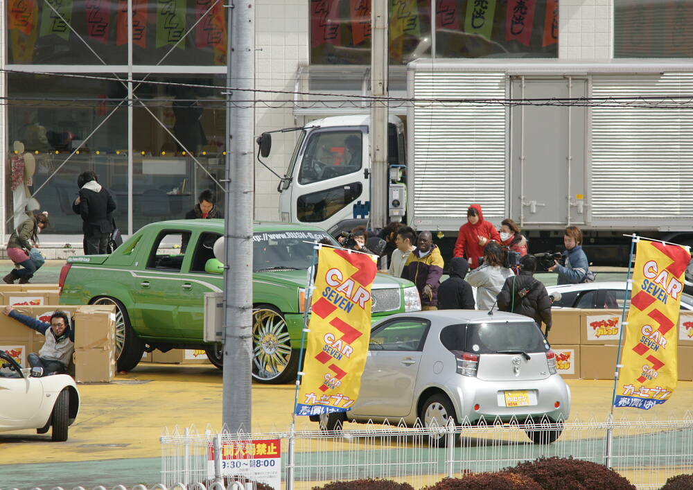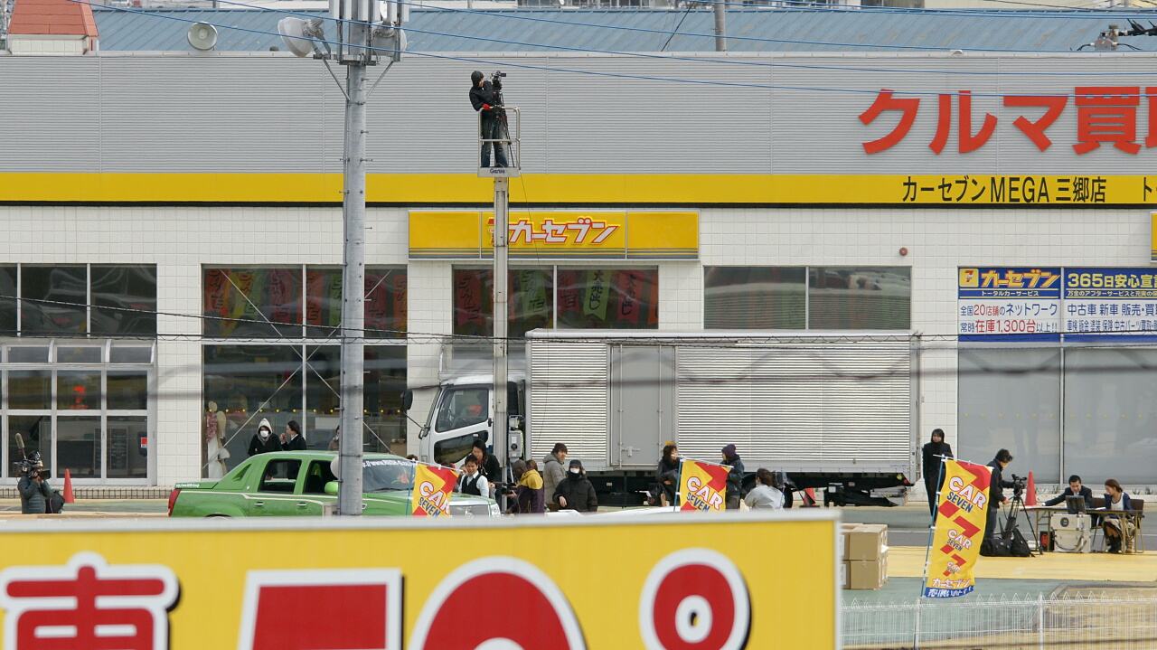 きょうの朝、荷物を配達に来た佐川の兄ちゃんが「トーサイ(TWK横の中古車屋の旧称)で芸能人が来てなんか撮影やってるっスねぇ」というので、あまり興味はないけどどんな事やってんのか屋上から盗撮してみることにした。