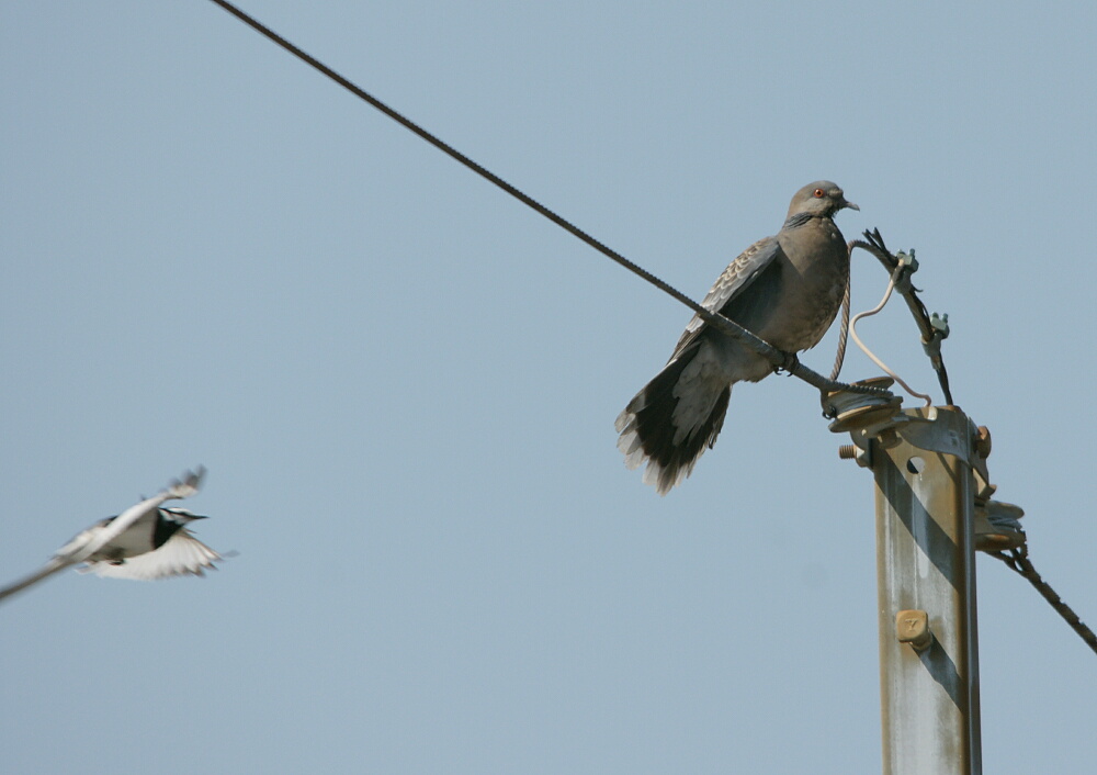 きょうの朝、TWK屋上から近くの電線の上でひなたぼっこしてるキジバトを撮ってたら、偶然飛んできたハクセキレイが写っていました↓