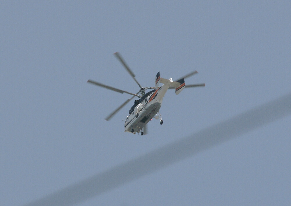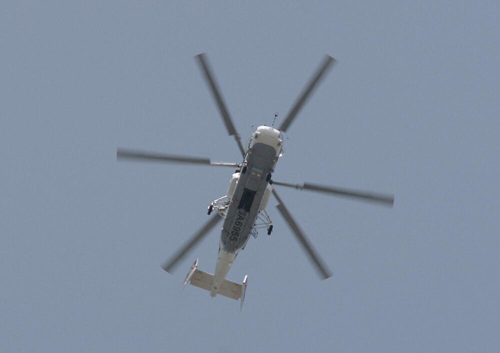 この「二重反転同軸ローター」の動きは見慣れていないのでヘンな感じ。たぶん上下のローターが交差する時に、タンデムローターのCH-47・チヌーク様と同じ種類の音が出るのだと思うが、真上にいる時は意外と静かだった↓