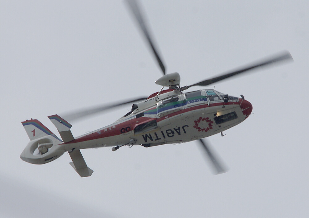 そろそろ防災訓練のシーズン(?)に突入。わが三郷市でもTWK近くの「市立北中学校」で小規模な防災訓練がきょう行なわれ、ちょうど私の「朝の運動」の時間に埼玉県防災航空隊のJA31TM「あらかわ1号」・通称“タマちゃん”が「上空偵察訓練」のために飛来してくれたので、屋上からアップで撮ることができた↓