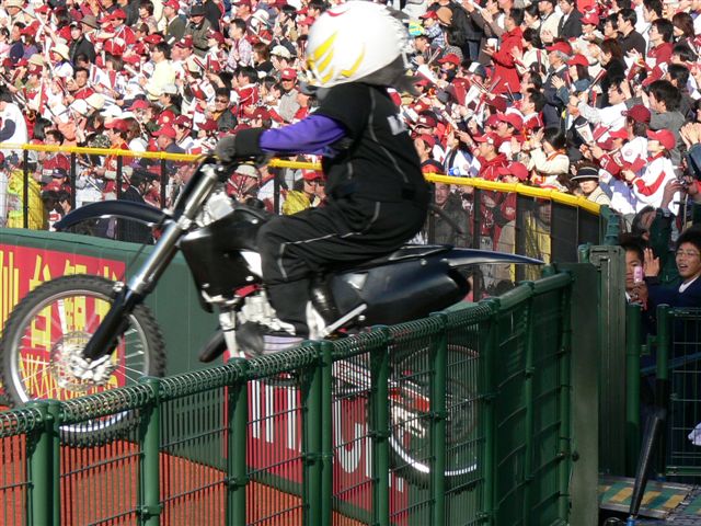 バイクはたぶんCR85かな!?これでこんなカッコして野球場のフェンスからグラウンドに飛び降りるとは、かなりの使い手と見た。