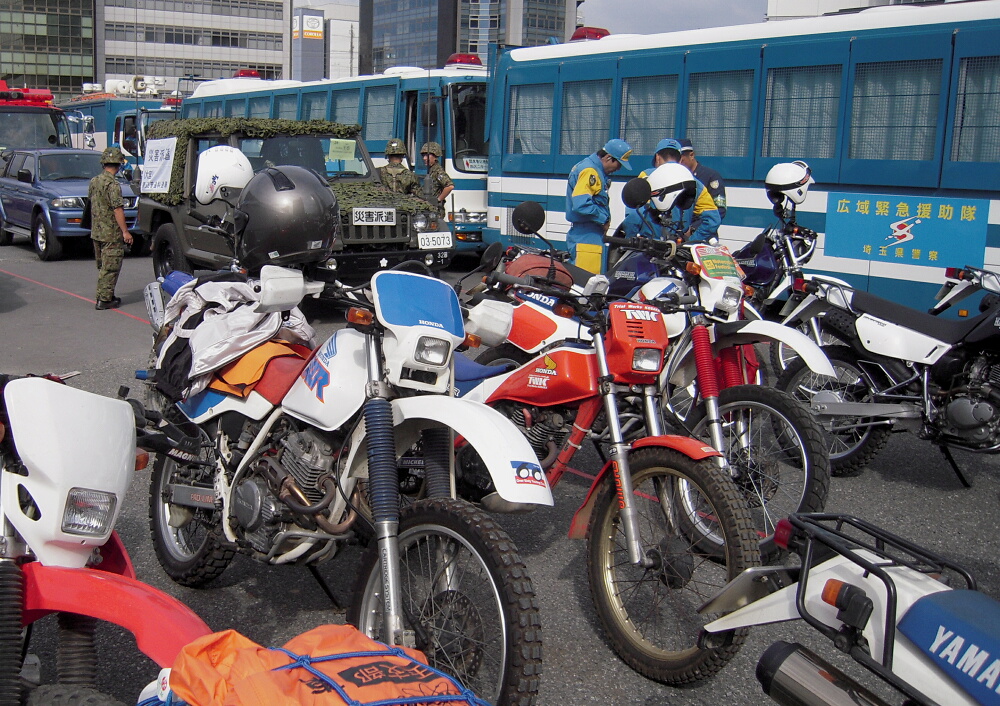 きょうは全国各地で防災訓練が行なわれたが、さいたま市中央区のさいたま新都心付近で行なわれた八都県市防災訓練(さいたま市会場)に「災害ボランティアバイクネットワーク関東・埼玉支部」の一員としてTLR200で参加した。