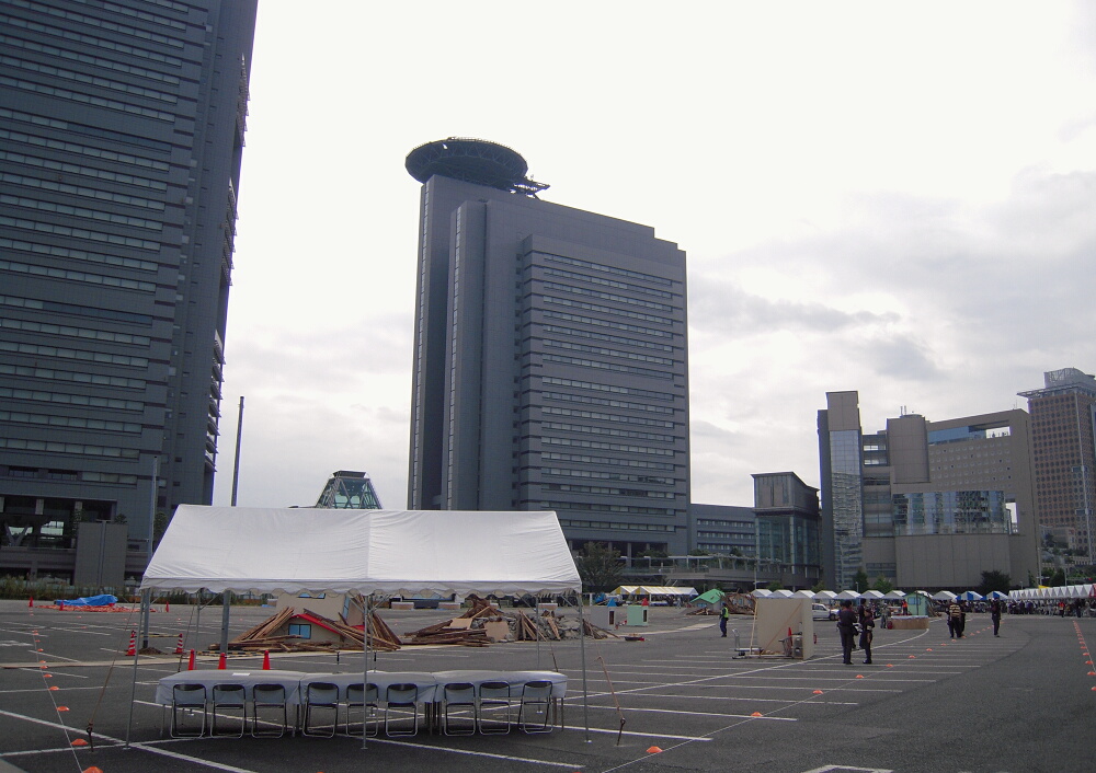 過去に参加した防災訓練では、防災ヘリがすぐ近くに設けられた臨時ヘリポートに離着陸したり、上空からの救助活動や消火作業を行なうところを間近で見ることができて大満足だった私ですが、今回は合同庁舎2号館屋上のヘリポート(上の写真の中央に見えている“お皿”)に2機が一度ずつ離着陸するだけで、写真を撮るにもヘリポート上は下からはまったく見えないし、おまけに逆光だし――― ヘリコプターを見るのを楽しみにしていた人間にとっては、じつに物足りない防災訓練でありました(ーー;)。