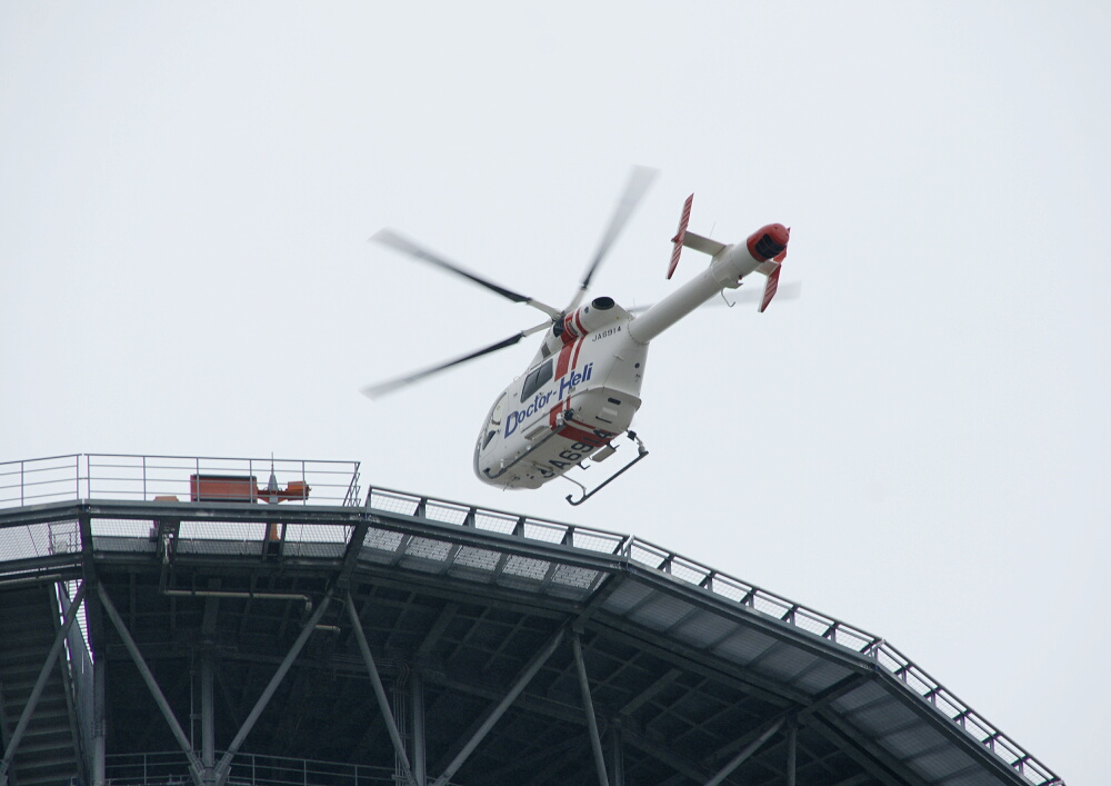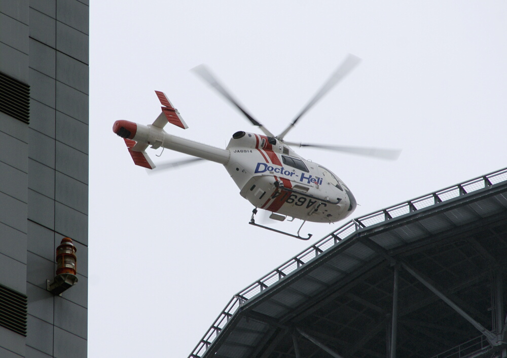 ↑JA6914・埼玉県ドクターヘリ(MD900)が、台風11号接近中で時おり強い風が吹く状況の中、屋上へリポートに着陸。
