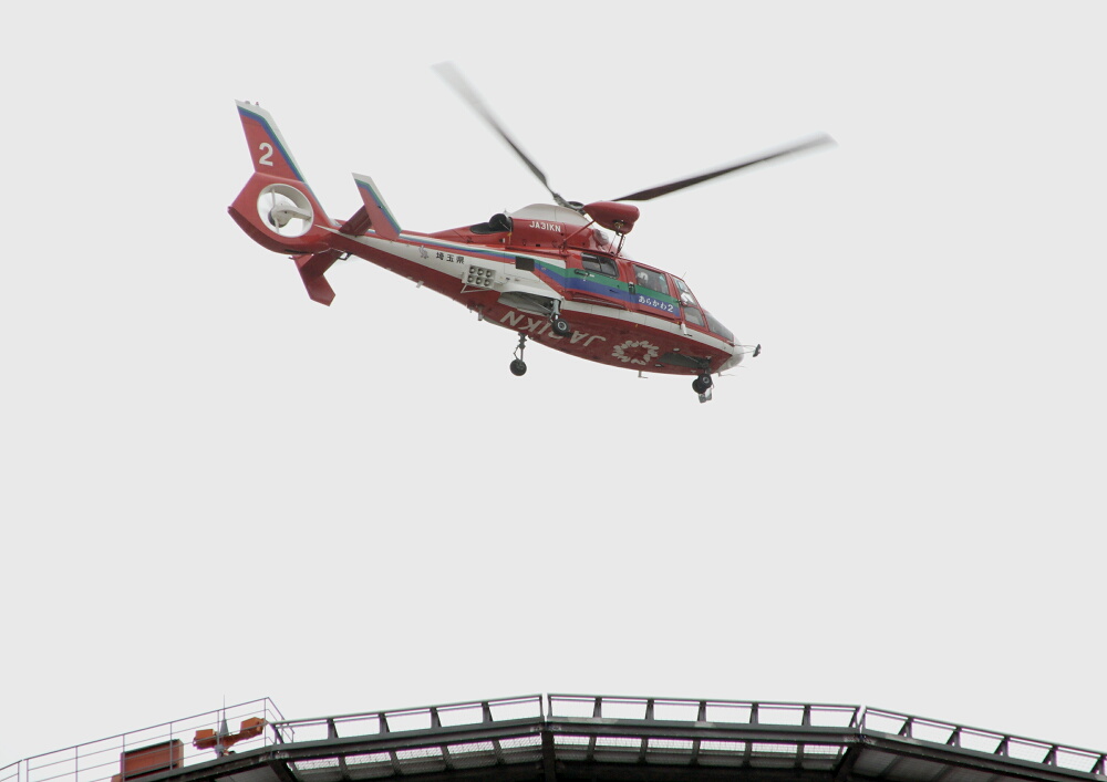 ↑JA31KN「あらかわ2」が屋上ヘリポートへアプローチ。相棒の「タマちゃん」はきょうは本庄会場張り付きで頑張ってたようです。