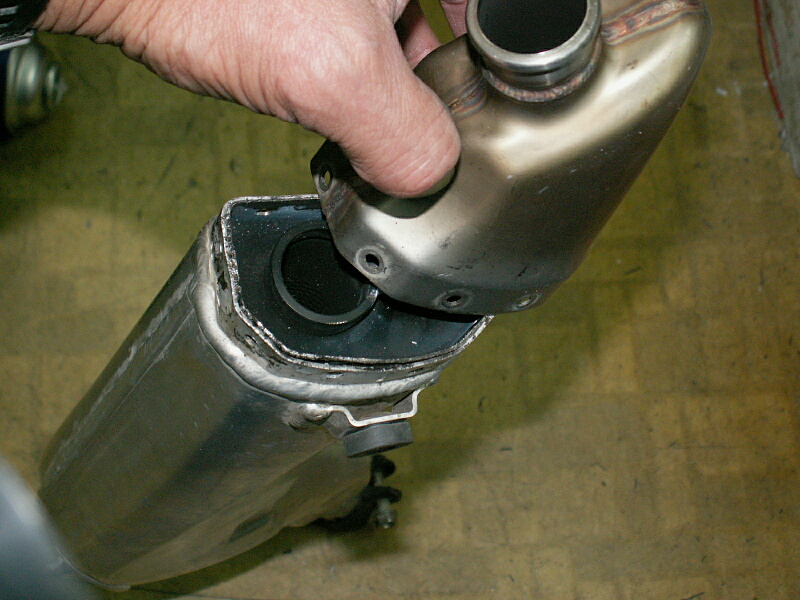 2ストのサイレンサーと違って、分解してグラスウールを交換する事はあまり想定してないのか、リベットを外しエンドキャップを取ると、さらに内側にも「蓋」がされていて、しかもそれがピッチピチにはめ込まれていて、さらにガッチガチにコーキングされちゃってて、引き抜くにも引っ張る部分がなく分解不能‥‥‥かと思われた。