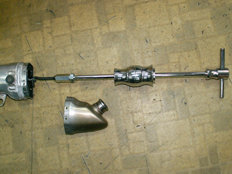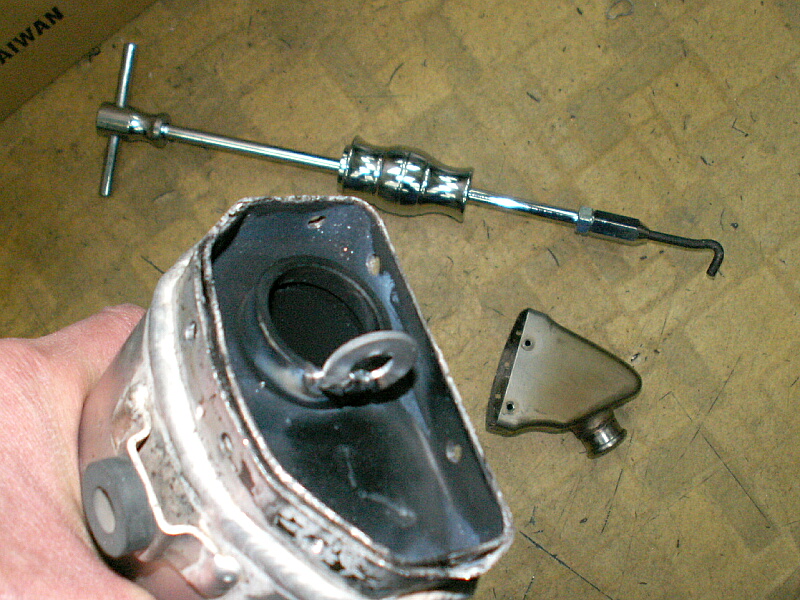 そして、以前「これは何かに使えそうだ」と思って買っておいた「スライドハンマー」を引っ掛け、ガン!ガン!!ガン!!!と何回かやったら、硬めのコーキング材でビッチリ固定されていた蓋も無事取り外すことができたのでした(^^)v。