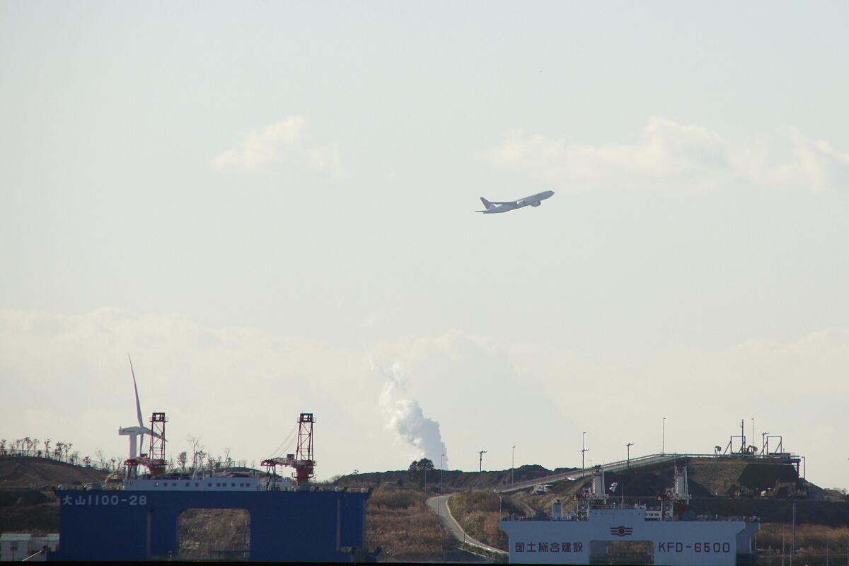 ↑羽田空港から飛び立つ旅客機。その下では取り付け道路の建設が急ピッチで進められている。