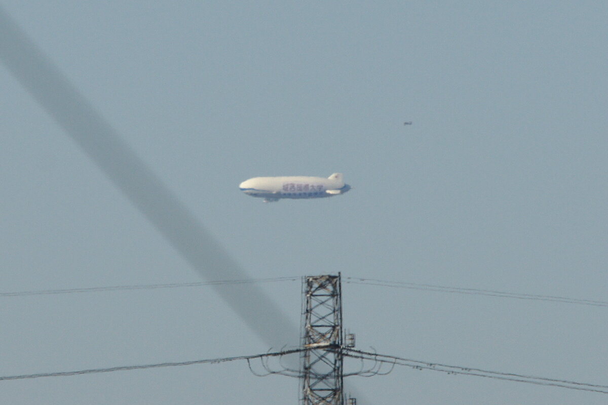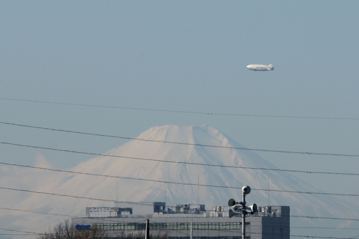 きょうの朝、“ツェッペリンNT”が定置場の桶川から都心上空に向かって飛行中、富士山の手前を通過するところをTWK屋上から撮ることができた。