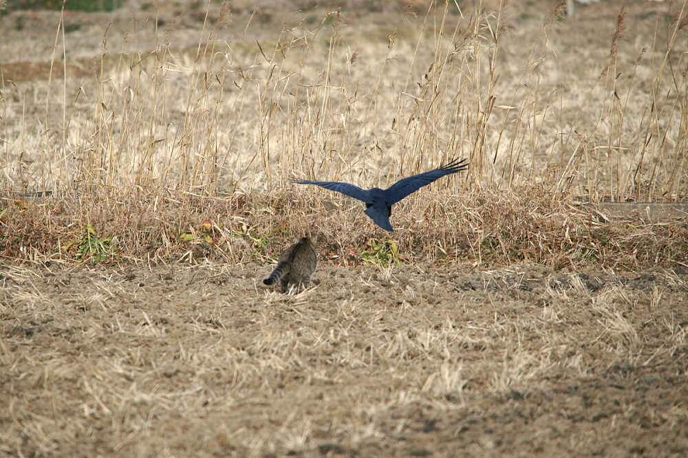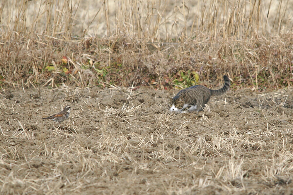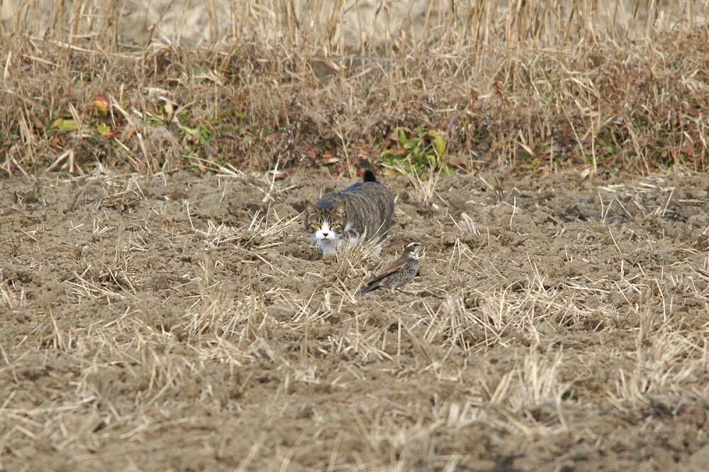私の後方から一羽のカラスがノラ猫めがけて一直線に飛んできて、得意の「モビング」でノラ猫を撃退し、ツグミちゃんは襲われずに済んだのでした。カラスもたまにはいいことするねぇ(^^)v。