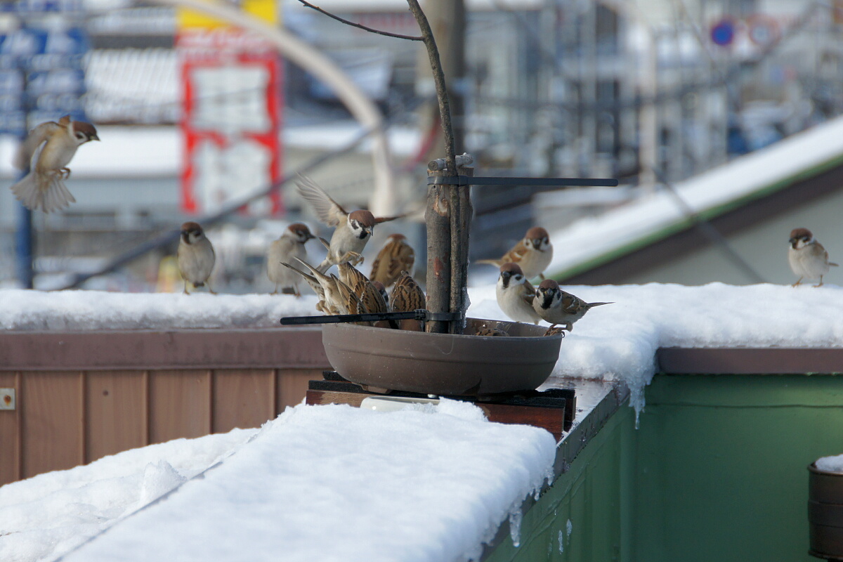 屋上に出ると、いつものようにスズメたちが集まってきて「おっちゃん、早くエサちょーだい!!」とねだるので、給餌場の周りだけ除雪してエサをあげました↓。